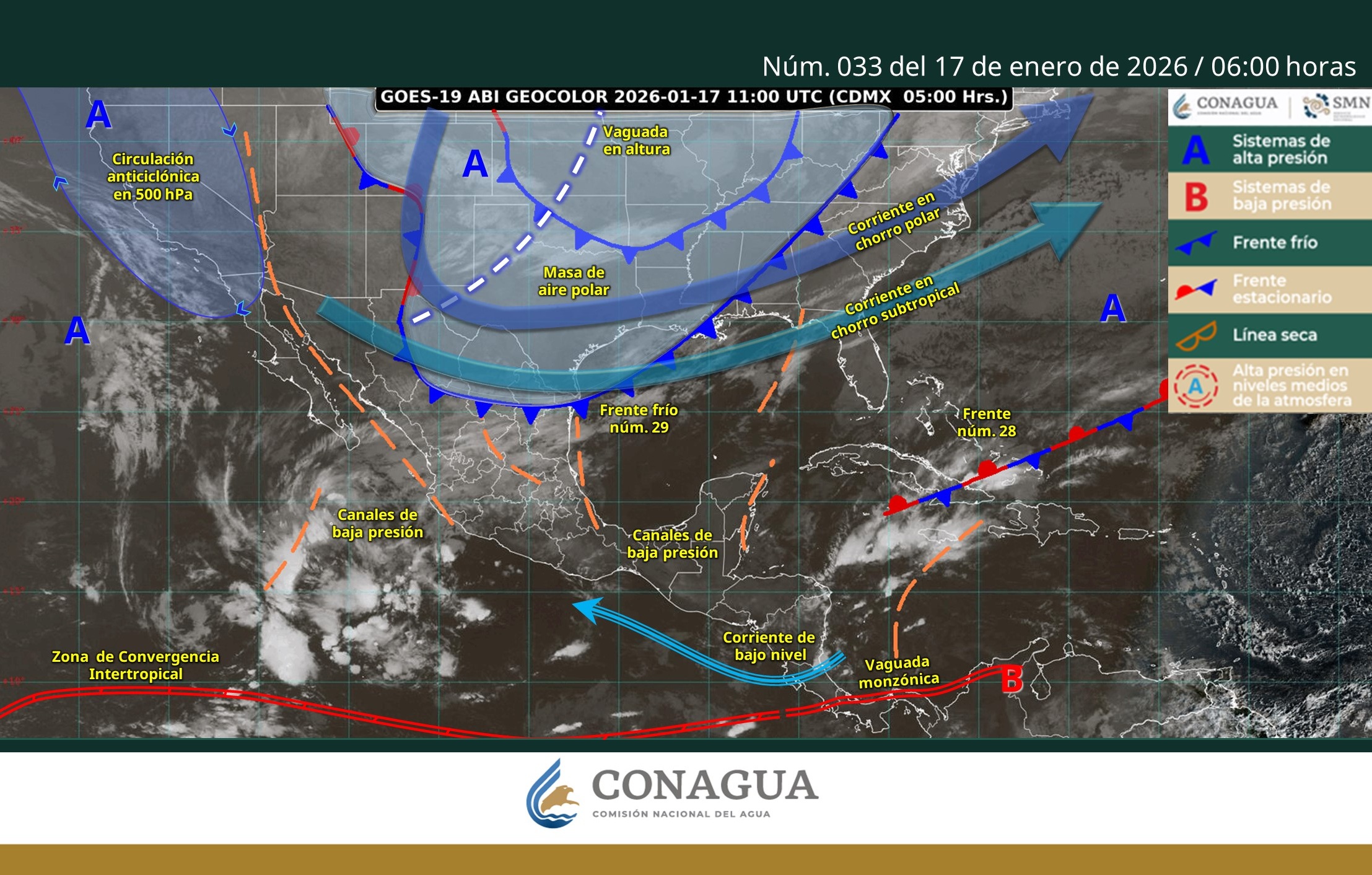 Para la jornada del sábado 17 de enero, CONAGUA anticipa que la interacción del frente frío con una vaguada en niveles altos y con corrientes en chorro favorecerá intervalos de chubascos y lluvias puntuales fuertes, acompañadas de actividad eléctrica y posible caída de granizo en sectores aislados; el organismo también prevé un evento de “Norte” con rachas intensas en la costa, lo que incrementa el riesgo de marejadas y oleaje elevado en la franja litoral de Tabasco.