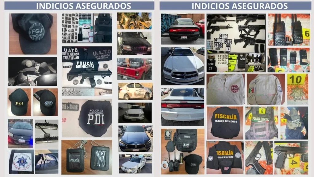 Entre las detenciones más relevantes, la FGJEM reportó la captura de seis sujetos en Huehuetoca tras una persecución en una SUV con luces estroboscópicas, donde se aseguraron armas, réplicas y vestimenta con escudos apócrifos; en Acambay fueron detenidos dos individuos con prendas que ostentaban las siglas “FGJ” y “PDI”; y en Tultitlán se detuvo a un hombre que disparó al ser marcado el alto. En los aseguramientos se recuperaron armas de fuego, cargadores, cartuchos y diversas dosis de narcóticos.