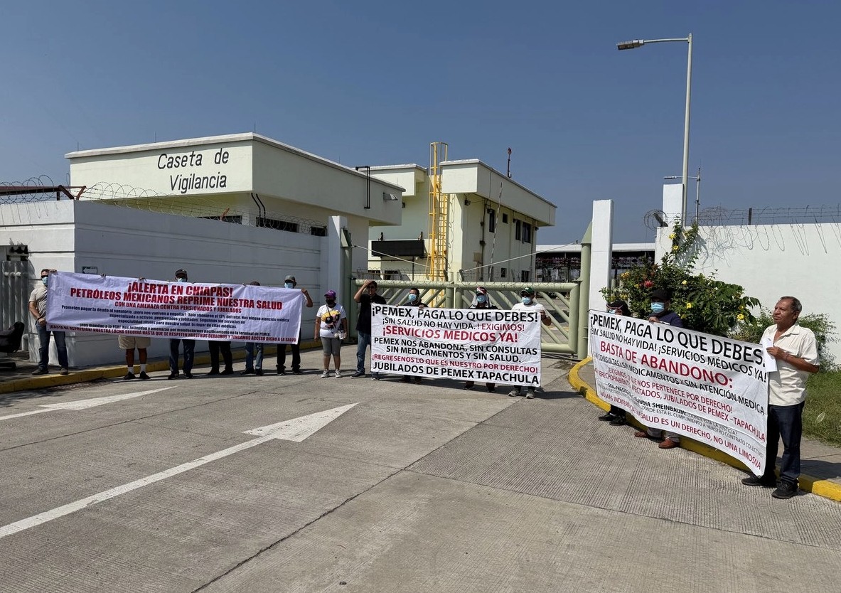 Chiapas ► Trabajadores de la Terminal de Almacenamiento y Despacho (TAD) de Pemex en Tapachula —que abastece de combustibles a una veintena de municipios de la frontera y la sierra chiapaneca— iniciaron una protesta pública para exigir la restitución de servicios médicos que, aseguran, no reciben desde hace más de un año por el incumplimiento de pagos de la paraestatal al hospital subrogado en la ciudad. Los empleados denunciaron que la atención en especialidades y la reposición de medicamentos quedó restringida desde diciembre de 2024, cuando el hospital Santa Fe suspendió servicios ante una deuda estimada en alrededor de 3 millones de pesos; la situación, dijeron, se agravó hasta la suspensión definitiva de atenciones hace tres meses.